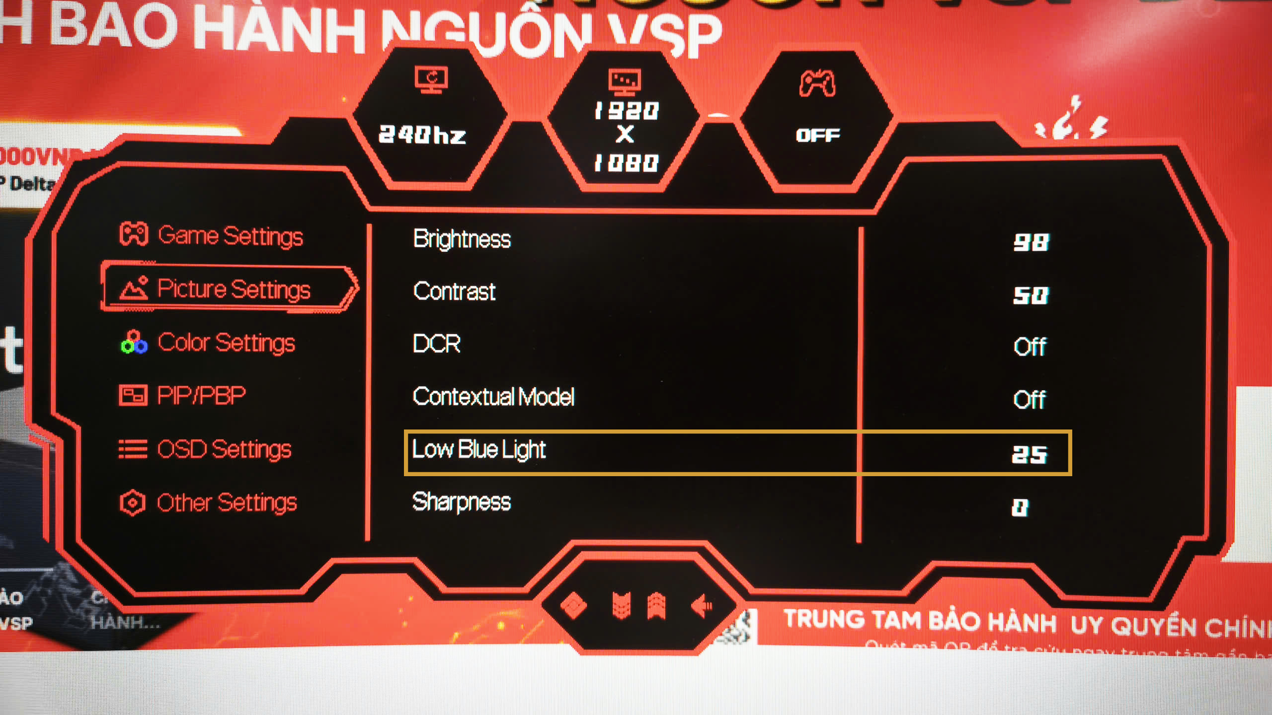 Bật tắt tính năng hạn chế ánh sáng xanh "Low Blue light" trong menu màn hình văn phòng VSP