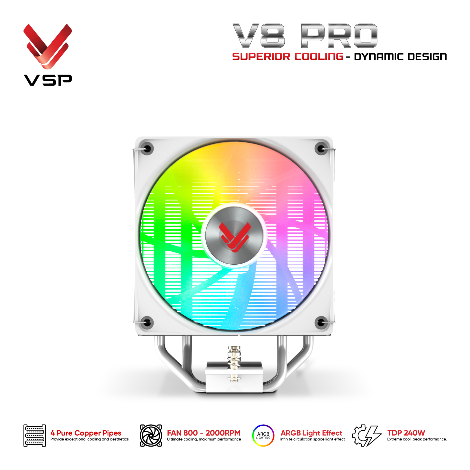 Tản Nhiệt Khí VSP V8 Pro White (LED Monitor / ARGB / 4 Pipes / 1 Fan / 240W)