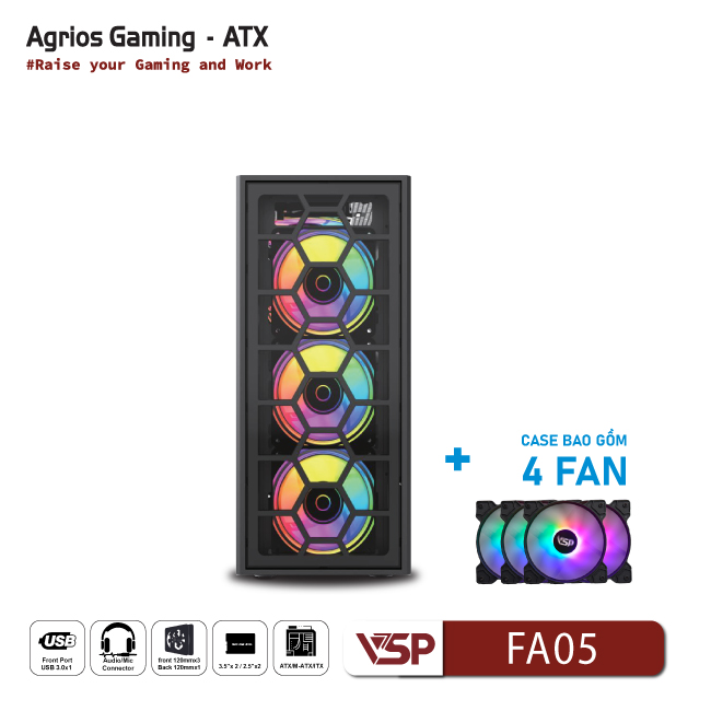Vỏ Case Máy Tính VSP Gaming FA05 - Đen + 4Fans Led