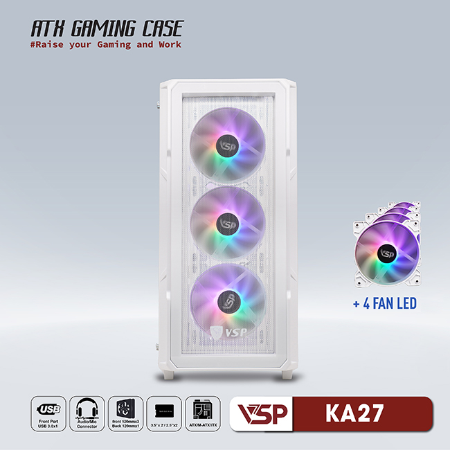 Vỏ Case Máy Tính VSP Gaming KA27 - Trắng + 4fans Led